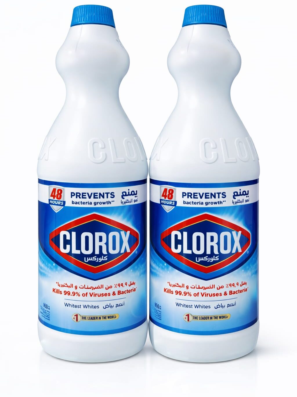 A powerful, all-in-one household cleaner and disinfectant. The 2-pack of 950 ml bottles is used to whiten clothes, remove tough stains, and kill 99.9% of common household germs, including viruses and bacteria, around the home and office. Kills 99.9% of common household viruses, bacteria, and fungi, and helps inhibit bacteria growth for up to 48 hours. Its active ingredient is sodium hypochlorite.