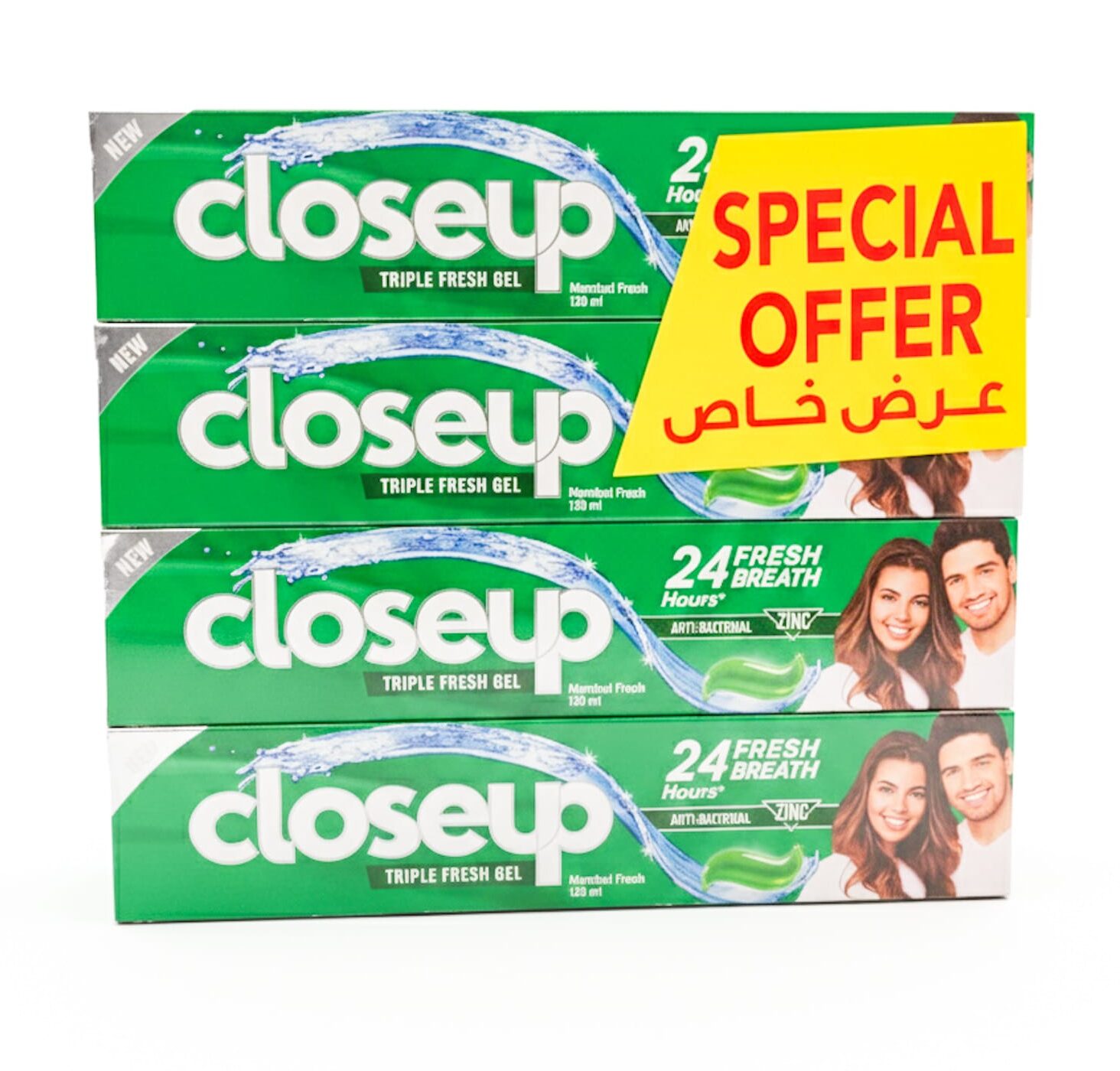 The Closeup Menthol Fresh 120ml toothpaste is available in a convenient pack of 4 x 120ml. The formula, containing an antibacterial mouthwash with active zinc, is clinically proven to kill up to 99% of bad-breath-causing bacteria and provides up to 12 hours of fresh breath. Which provides long-lasting freshness and deep cleaning with its Triple Fresh Formula.