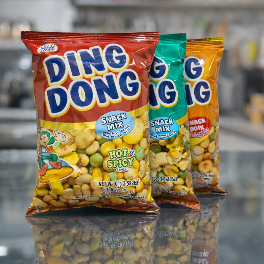 The “Ding Dong” snack mix is a popular Filipino product that typically includes a mix of corn bits, peanuts, green peas, and broad beans. The specific contents can vary by flavor.