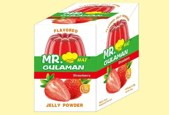 It is made from natural seaweed extract, specifically agar-agar, making it a vegetarian and plant-based alternative to animal-derived gelatin. It provides a smooth, firm texture that is a hallmark of traditional Filipino gulaman desserts. It features a delightful strawberry flavor and produces a smooth, firm texture once set. This strawberry-flavored jelly is highly versatile and used in a variety of desserts and beverages.