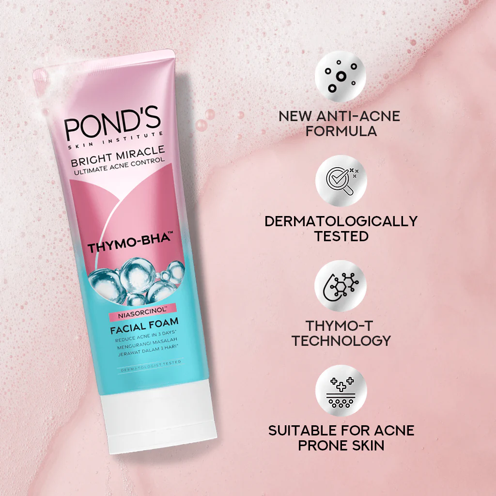 The Pond’s Bright Miracle Ultimate Acne Solution THYMO-BHA Facial Foam 100g offers a dual-action approach to skincare: it is clinically proven to reduce acne while also providing significant skin brightening benefits.The primary benefit is effective acne control through deep cleansing and anti-bacterial action.