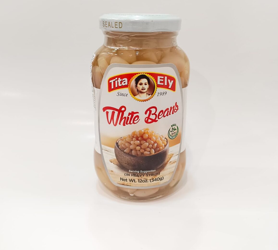 A jar of white beans that have been sweetened with syrup, commonly used as an ingredient in various Filipino desserts like Halo-halo.